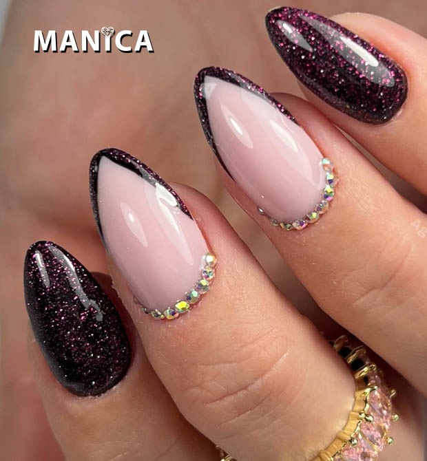 Dwa paznokcie z z french i cyrkoniami, a reszta w ciemnym, brokatowym kolorze. Minimalny wysiłek, maksymalny efekt.