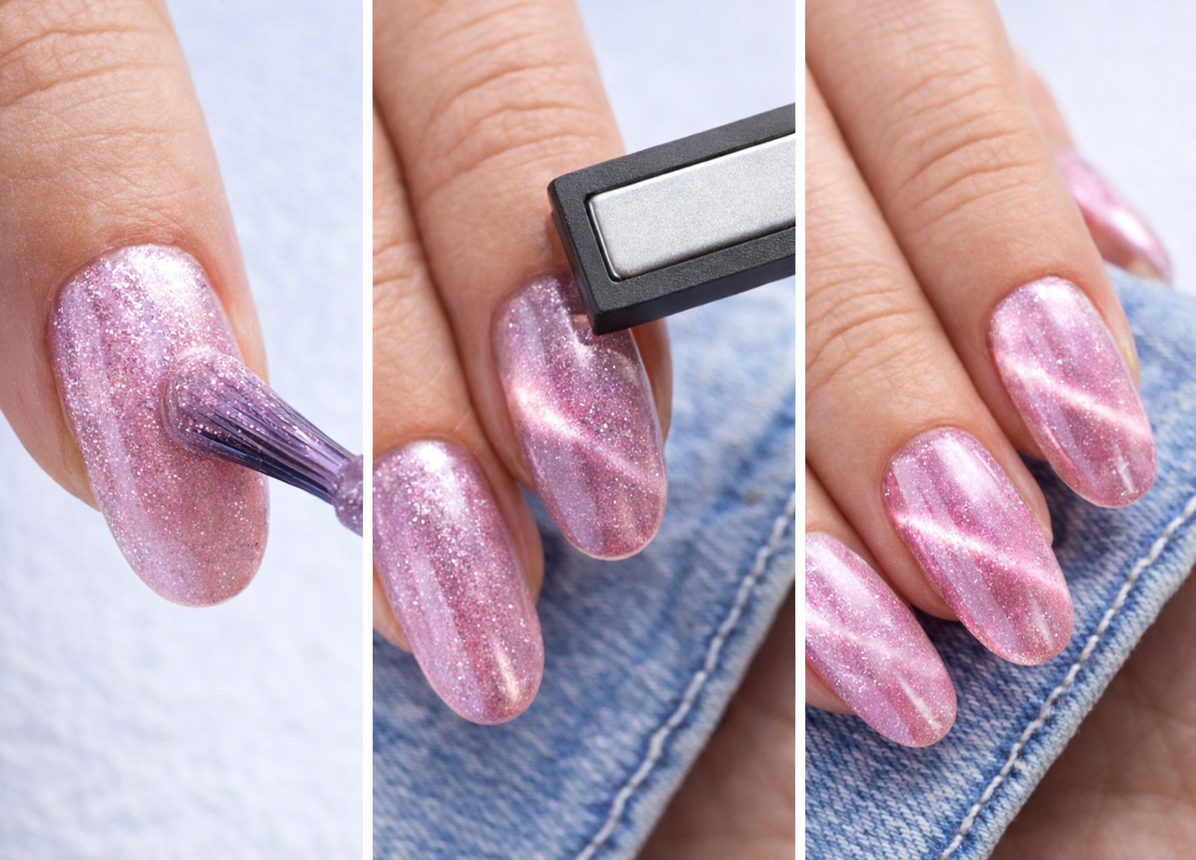 Efekt cat eye dodaje manicure głębi i magnetycznego połysku. Poniżej ilustracja krok po kroku: