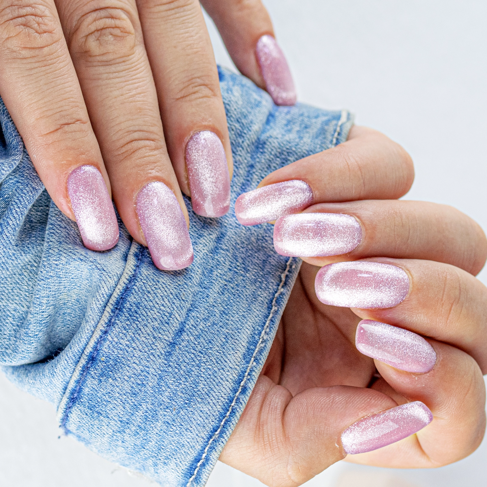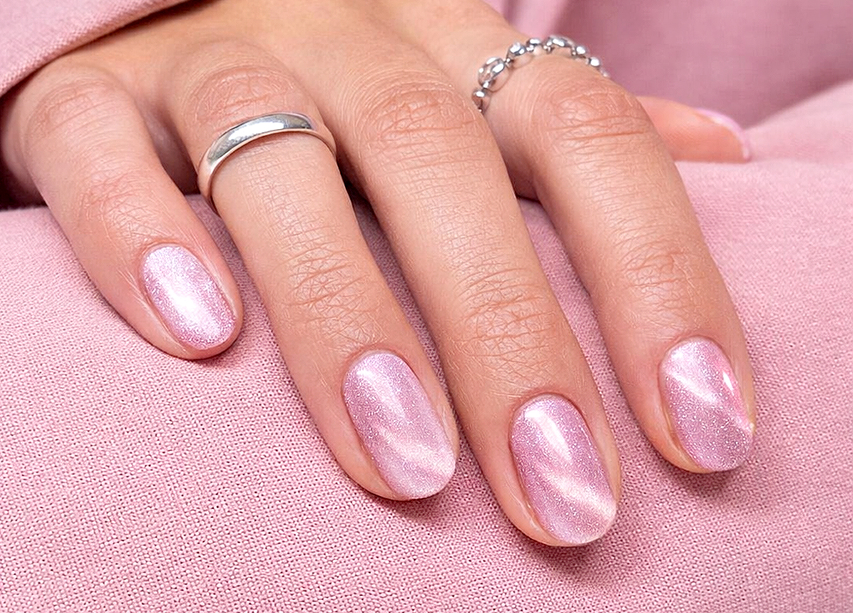 Delikatny róż z efektem cat eye sprawia, że manicure wygląda elegancko, subtelnie i pięknie odbija wiosenne światło.