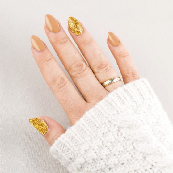 Jasny, ciepły brąz z drobinkami w kolorze złotym i multikolor.