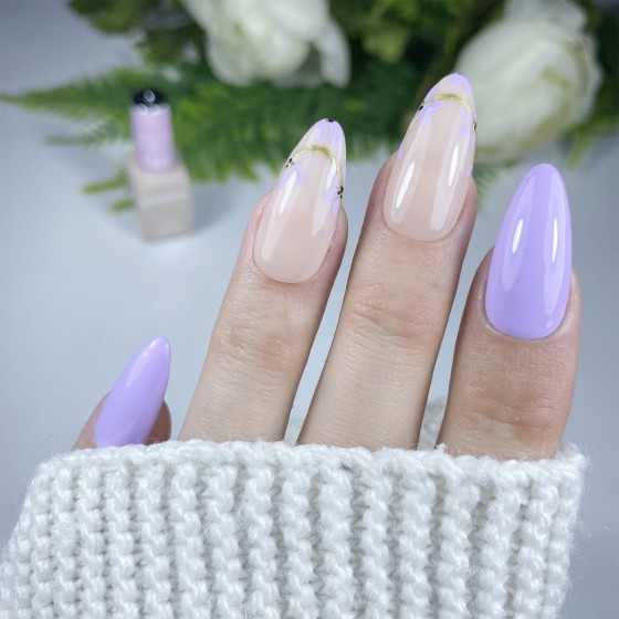 Na utwardzoną wcześniej bazę nałożyć jedną lub dwie warstwy lakieru hybrydowego Grape Glam i zabezpieczyć top lub top no wipe.