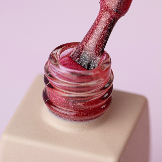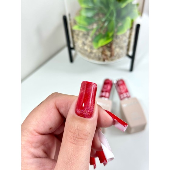 Czerwony odcień z migoczącymi drobinami z efektem kociego oka. *na zdjęciu lakier prezentowany jest na czarnym podkładzie...
