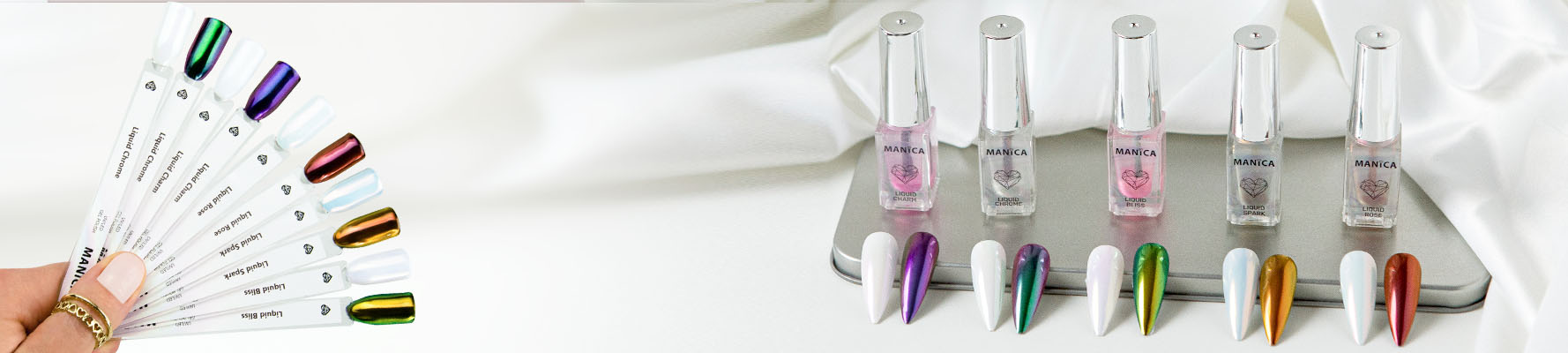 Nasz pyłek najlepiej prezentuje się na białej hybrydzie – wtedy najbardziej uwidacznia się różowa poświata ze złotym akcentem. Przepięknie wygląda również na jasnoróżowym podkładzie. Natomiast na czarnym lakierze zmienia się w pomarańczowo złotą taflę, która na brzegach przybiera odcień jasnego złota. Oczywiście Manica Liquid Spark możesz stosować na każdym kolorze nadając mu zupełnie nowego wyrazu..
