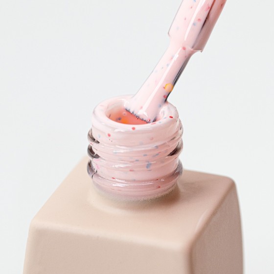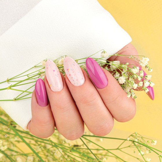 Różowo-brzoskwiniowa baza, delikatnie ozdobiona maleńkimi różowymi i niebieskimi kropeczkami, przypomina wiosenne konfetti...