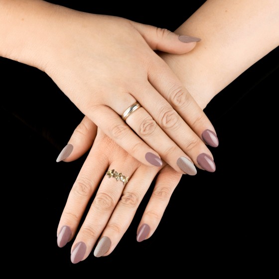 Nasz pyłek najlepiej prezentuje się na białej hybrydzie – wtedy najbardziej uwidacznia się różowa poświata ze złotym akcentem. Przepięknie wygląda również na jasnoróżowym podkładzie. Natomiast na czarnym lakierze zmienia się w jasną złotą taflę, która przybiera zielony odcień.